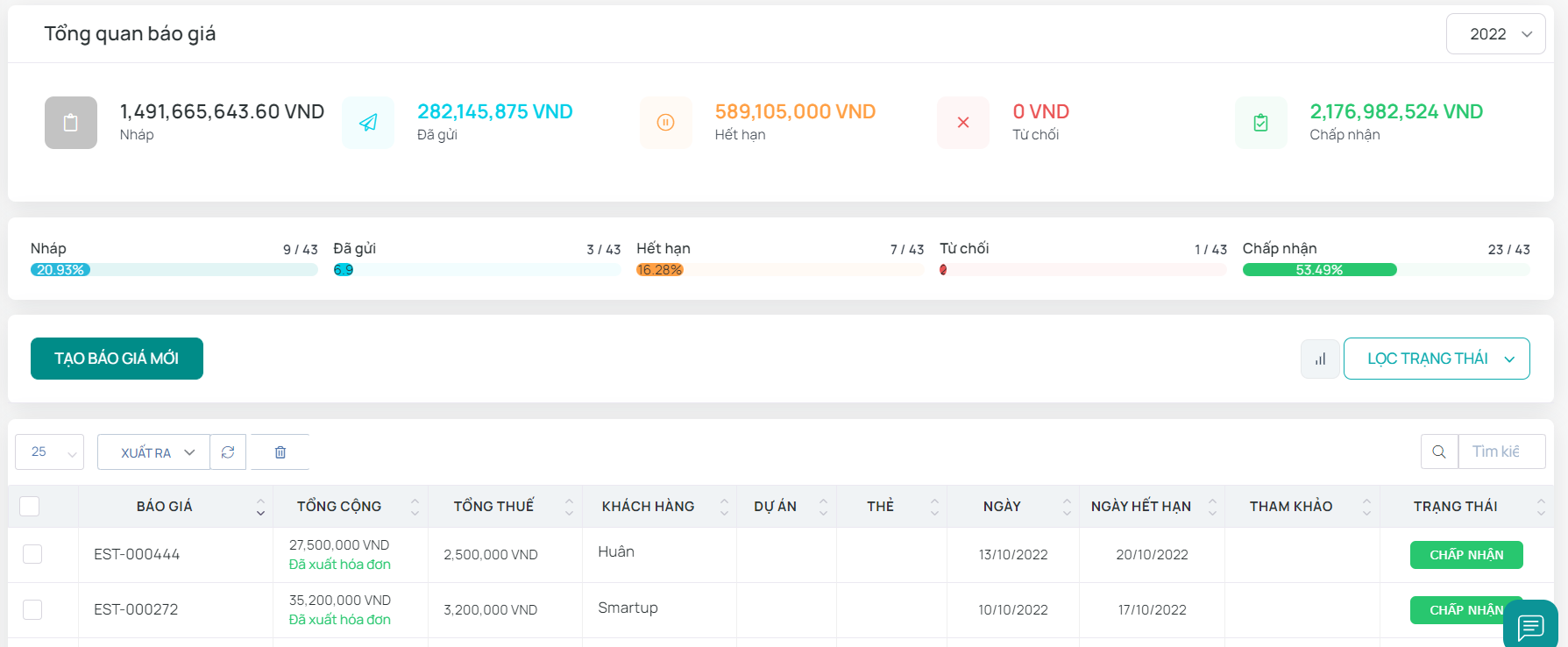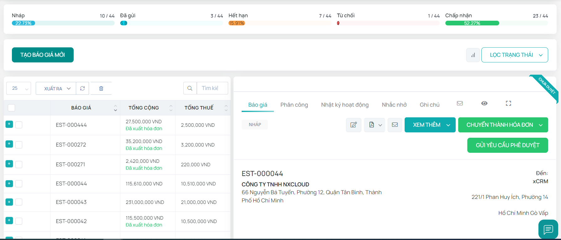 Sau khi bấm nút lưu lại, báo giá sẽ được lưu dưới trạng thái nháp, để nhân viên kinh doanh kiểm tra lại các thông tin trước khi gửi lên cho quản lý phê duyệt báo giá.