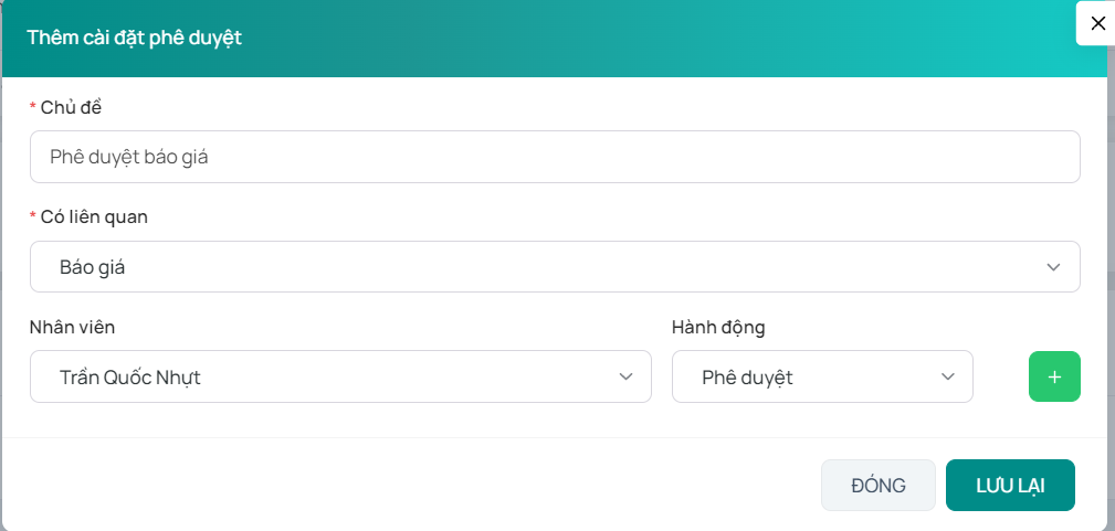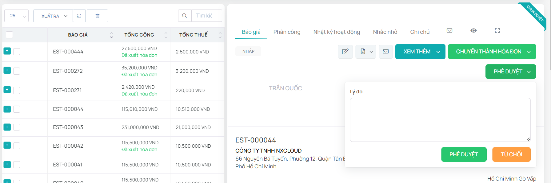 Nhân viên: chọn nhân viên sẽ phê duyệt báo giá