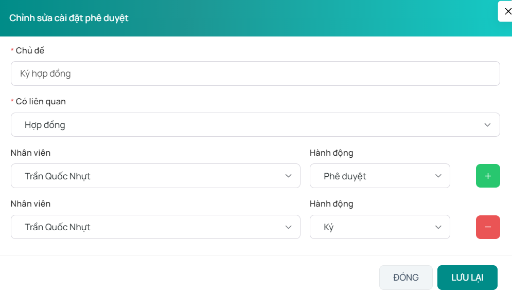 Lưu ý: có thể tạo phê duyệt và cả ký tên trong cùng một phê duyệt bằng cách click vào dấu +