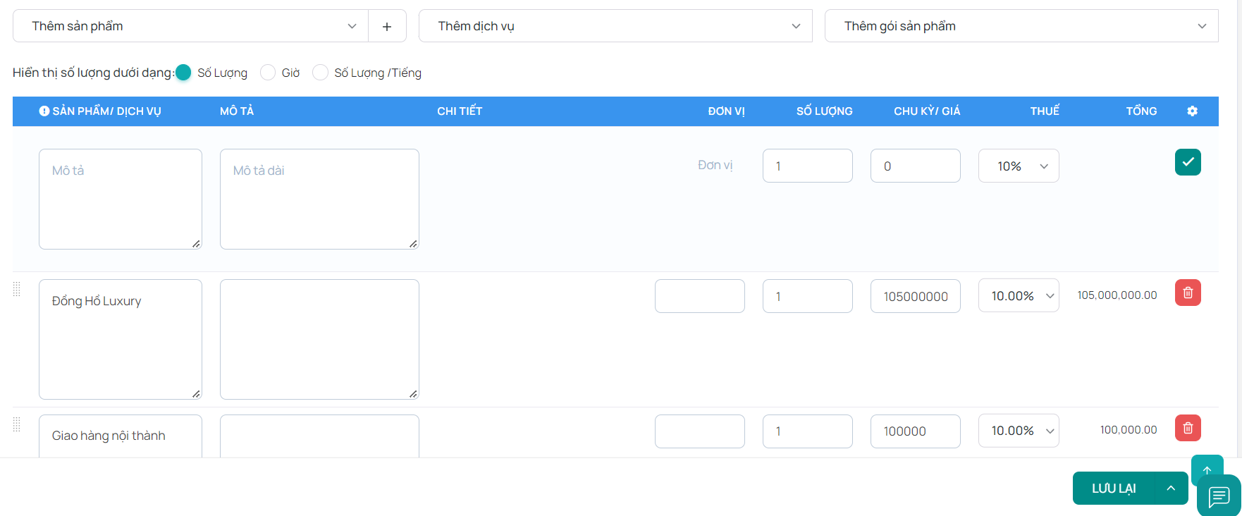 \-         Nhập số lượng, giá bán và thuế của sản phẩm.